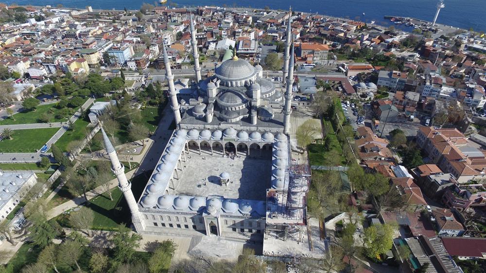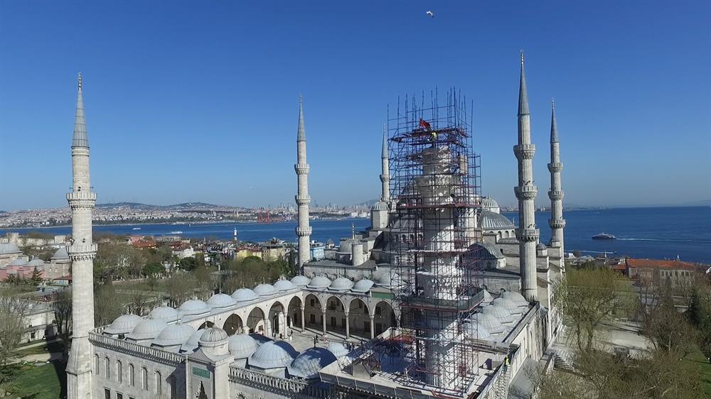Tarihi Sultan Ahmet Cami'nin minaresindeki kayma sebebi ile 400 yıl sonra yapılan restorasyon çalışması havadan görüntülendi.