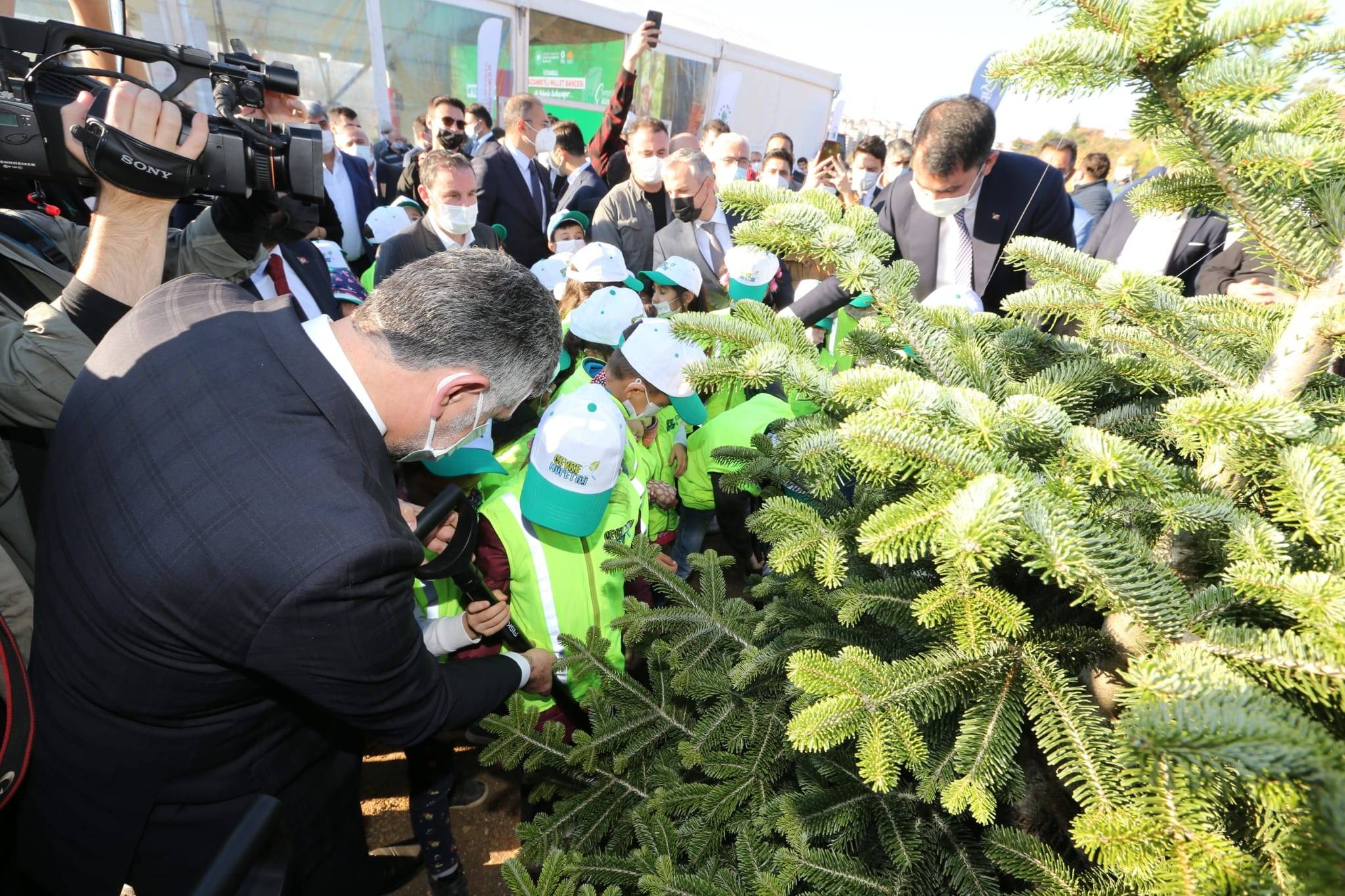 Bakan Kurum’un konuşmasının ardından katılımcılar “Çevre Müfettişi” çocuklarla hatıra fotoğrafı çektirdi. Ardından Bakan Kurum ve Başkan Keskin çocuklarla Millet Bahçesi’nin ilk fidanlarını toprakla buluşturdu.