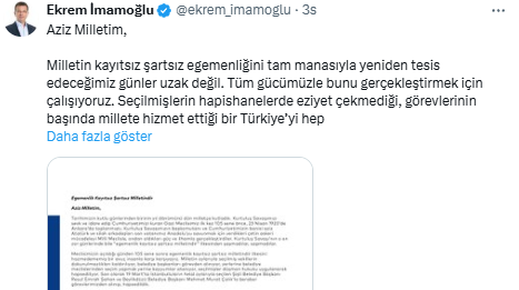 Hakkında, “İhaleye fesat karıştırma, rüşvet, irtikap, kişisel bilgileri yasadışı yollarla ele geçirme, yolsuzluk, usulsüzlük, teröre yardım” suçlarından yürütülen soruşturma kapsamında tutuklanarak Silivri Cezaevi’ne konulan CHP’li eski İstanbul Büyükşehir Belediye (İBB) Başkanı Ekrem İmamoğlu, sosyal medya üzerinden yeni bir açıklama yaparak fitne saçmaya devam etti.