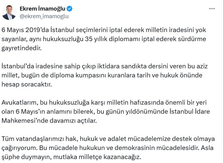 “Avukatlarım, bu hukuksuzluğa karşı milletin hafızasında önemli bir yeri olan 6 Mayıs’ın anlamını bilerek, bu günün yıldönümünde İstanbul İdare Mahkemesi’nde davamızı açtılar” diyen İmamoğlu, “Tüm vatandaşlarımızı hak, hukuk ve adalet mücadelemize destek olmaya çağırıyorum. Bu mücadele hukukun ve demokrasinin mücadelesidir. Asla şüphe duymayın, mutlaka milletçe kazanacağız” diye yazdı.