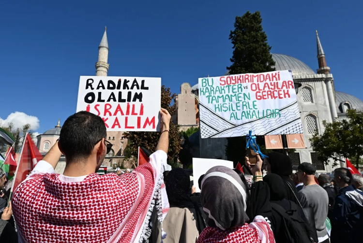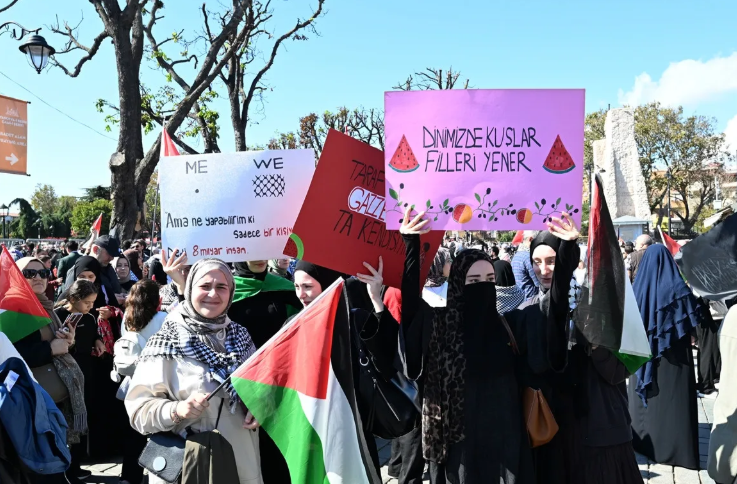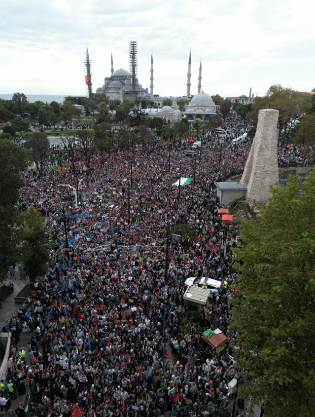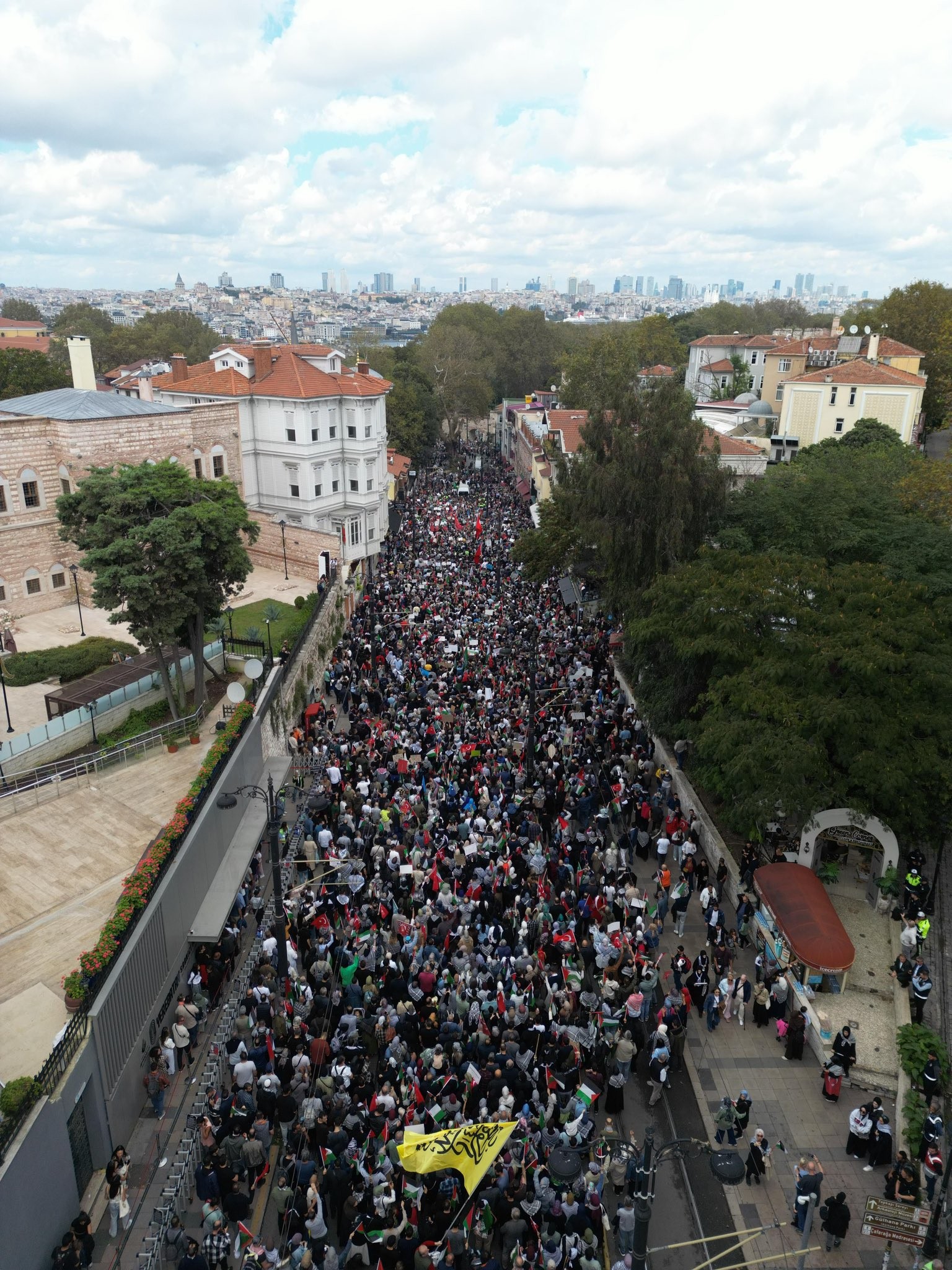 Ayasofya’da hareket eden kalabalık Eminönü Meydanı’na yürüyüş başladı. Yürüyüşte, “Gazze’deki soykırıma son”, “Filistin’e özgürlük” ve “Ablukayı kaldır” gibi sloganlarla Filistin halkıyla dayanışma mesajı veriliyor.