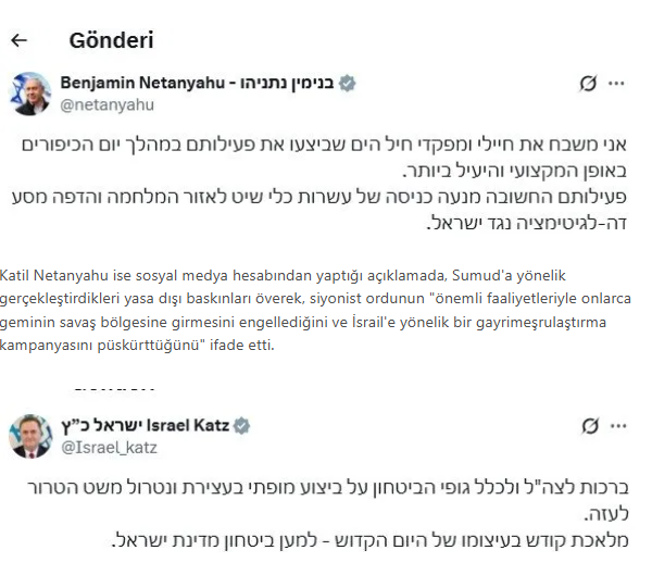 Siyonist İsrail, Gazze’ye insani yardım götüren Küresel Sumud Filosu’na uluslararası sularda saldırarak onlarca gemiye saldırı düzenledi, çok sayıda sivili alıkoydu. Netanyahu ve Katz yasa dışı baskını “meşruiyet” söylemleriyle savunurken, dünya kamuoyu bir kez daha İsrail’in işgalci ve hukuk tanımaz yüzüne tanık oldu.