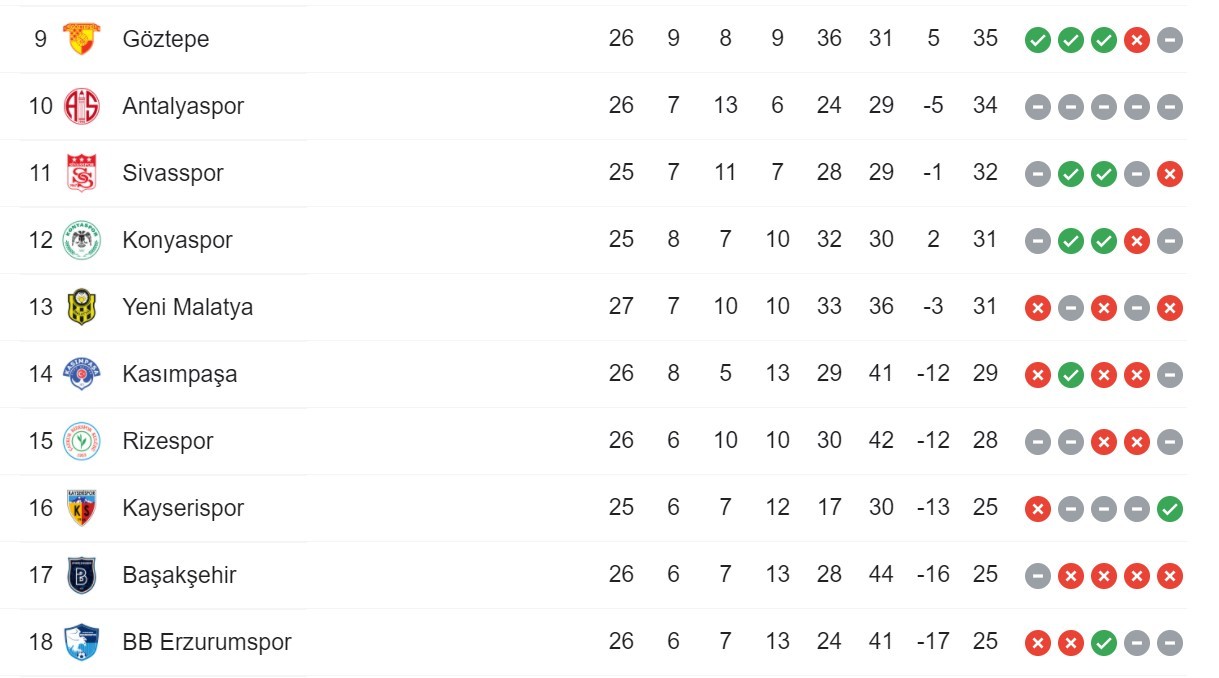 Süper Lig'de heyecan tüm hızıyla devam ediyor. Ligde yeni haftaya bugün oynanan 2 maçla girildi. İşte hem alt hem de üst sıraların karıştığı ve merakla araştırılan Süper Lig 28. hafta puan durumu...