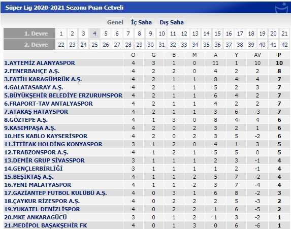 Koronavirüs salgını sebebiyle 2019-2020 sezonu temmuz ayında tamamlandı. Bu sebeple 2020-2021 sezonu eylül ayında başladı. Ligde 4 hafta geride kalırken maçlara milli ara verildi. Milli maçların ardından gözler Süper Lig’e çevrildi. Süper Lig’de 5. hafta 17 Ekim’de oynanacak maçlarla başlayacak. 21 takımın yer aldığı Süper Lig’de haftayı bay geçen takım Beşiktaş olacak.