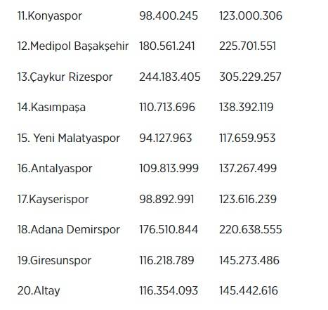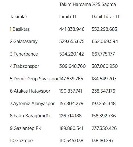 Süper Lig kulüplerinin harcama limitleri şöyle: