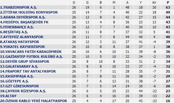 Süper Lig puan durumu güncel