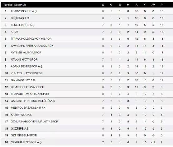 Trabzonspor 18 puanla liderlik koltuğunu korudu. Beşiktaş 3 puan alarak 17 puanla 2. sırada yer aldı. Fenerbahçe'nin puanı ise 16.