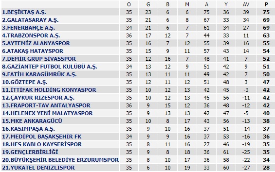 Süper Lig puan durumu güncel | Süper Lig'de heyecan tüm hızıyla sürüyor. 37. hafta 25 Nisan Pazar akşamı oynanacak Fenerbahçe Kasımpaşa maçıyla noktalanacak. Zirve yarışı için son derece önemli olan maçı merakla bekleyenler, ligde son durumu da araştırıyor. Peki, Süper Lig'de Beşiktaş'ın kaç puanı var? Süper Lig puan durumu