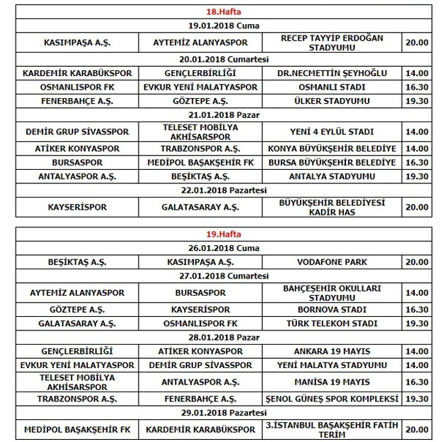 Spor Toto Süper Lig'de ikinci yarının 18. ve 19. haftalarının maç programları açıklandı.