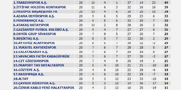Süper Lig'in 20. haftası, oynanan tek maçla sona erdi.