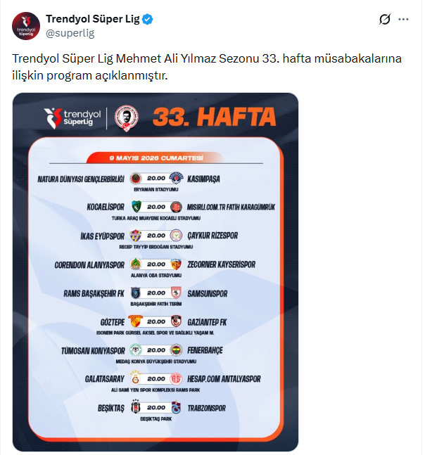 Türkiye Futbol Federasyonu,(TFF) Süper Lig 33. hafta müsabakalarına ilişkin programı duyurdu. Tüm maçlar 9 Mayıs Cumartesi günü saat 20.00'de oynanacak.