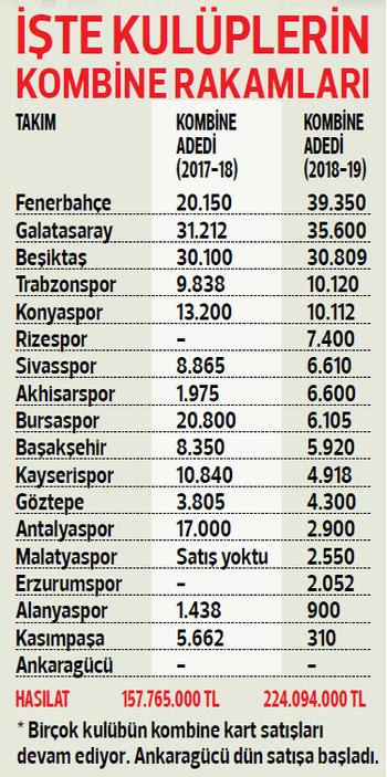 18 takım 1 Ağustos itibariyle yüzde 42 artışla 224 milyon liralık kombine sattı. Bu rakamın yüzde 39’unu tek başına Fenerbahçe elde etti.