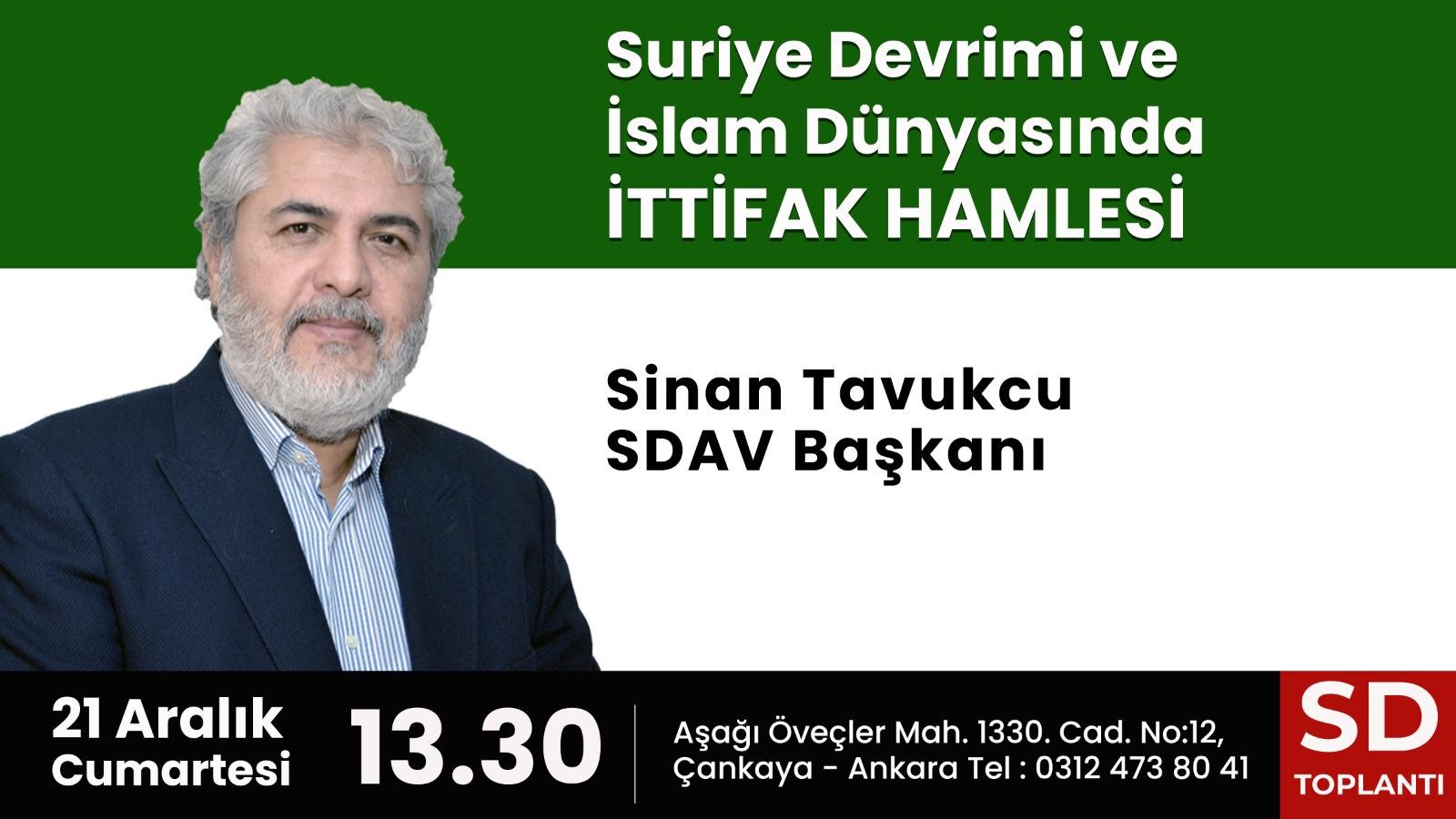 Ankara’da 21 Aralık Cumartesi günü, saat 13.30’da “Suriye Devrimi ve İslam Dünyasında İttifak Hamlesi” başlıklı bir toplantı gerçekleştirilecek. Etkinlikte, SDAV (Sosyal Düşünce Araştırmaları Vakfı) Başkanı Sinan Tavukcu konuşmacı olarak yer alacak.