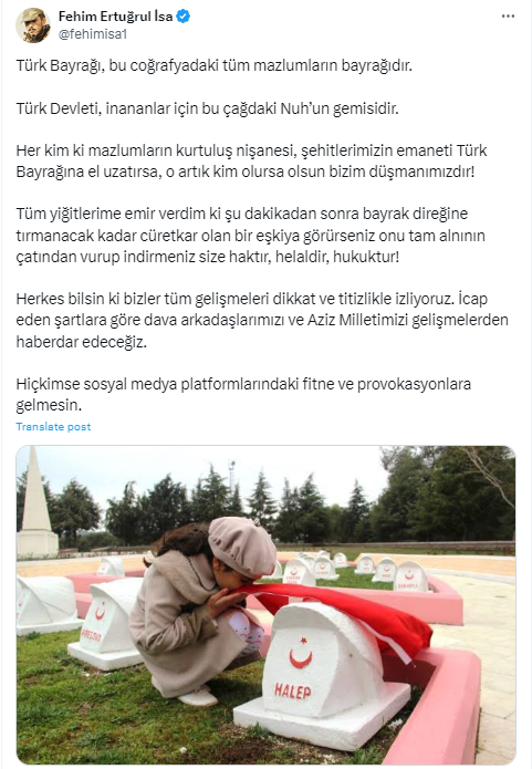 Suriye ile ilişkilerin normalleşmesine yönelik adımların atıldığı dönemde Kayseri’de meydana gelen taciz olayı, karanlık eller tarafından provokasyona dönüştürüldü. Kayseri ve Suriye'de peş peş meydana gelen provokasyonlara en güzel cevabı Suriye Milli Ordusu Komutanı Fehim Ertuğrul İsa verdi. "Türk Bayrağı, bu coğrafyadaki tüm mazlumların bayrağıdır" diyen İsa, "Şehitlerimizin emaneti Türk Bayrağına el uzatırsa, o artık kim olursa olsun bizim düşmanımızdır!" ifadelerini kullandı.