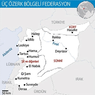 La Stampa, Rusya’nın planlarına yönelik bir harita yayınlarken, Suriye’nin üçe bölünmesinin gündemde olduğunu iddia etti. Buna göre, kuzey ve kuzeydoğu Kürtlerin, merkez ve doğu Sünnilerin özerk bölgesi olacak. Halep’ten Şam’a uzanan sahil kesimi ise Şii Nusayriler, Dürziler, Sünniler ve diğer azınlıkların yaşayacağı üçüncü özerk bölge olacak. Türkiye’nin kırmızı çizgi ilan ettiği Azez-Cerablus hattının ise Sünni bölgesine dahil edildiği iddia edildi. Böylece batıdaki Afrin, diğer Kürt kantonlarıyla birleşmezken tüm özerk bölgelerin Türkiye ile sınırı bulunacak.