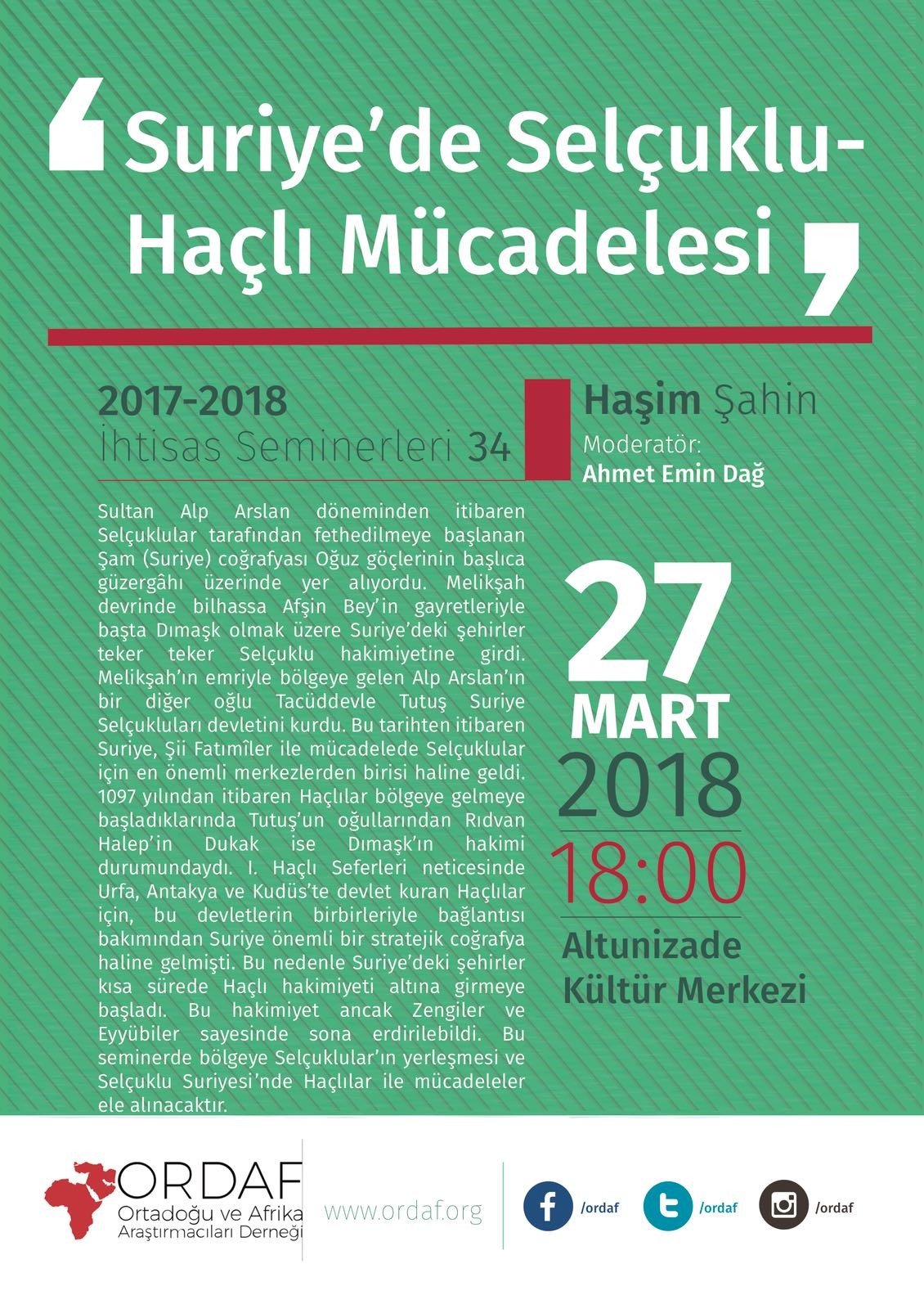 Ortadoğu ve Afrika Araştırmacıları Derneği tarafından 27 Mart tarihinde Suriye’de Selçuklu-Haçlı Mücadelesi semineri yapılacak.