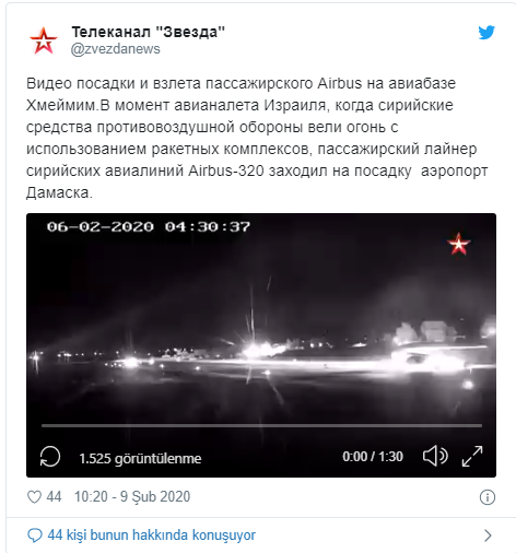 Rusya Savunma Bakanlığı’na bağlı Zvezda Televizyonu, perşembe sabahı iniş yapacağı başkent Şam’a yaklaştığı sırada, Suriye'nin hava savunma sistemleri tarafından vurulma tehlikesiyle karşı karşıya kalan yolcu uçağının, Lazkiye yakınlarındaki Rus hava üssü Hmeymim’e iniş görüntülerini yayınladı.