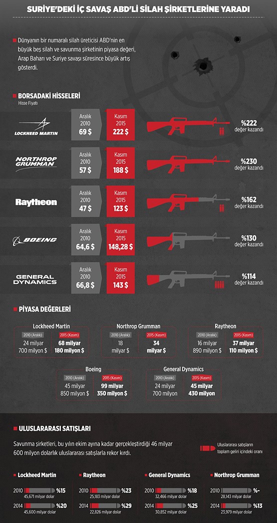 Dünyanın bir numaralı silah üreticisi ABD’nin en büyük silah şirketlerinin piyasa değeri, Suriye savaşı süresince büyük artış gösterdi.