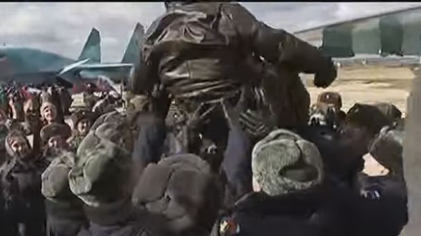 Sputnik'in haberine göre Rus Hava Kuvvetleri Komutanı Viktor Bondarev'in de yer aldığı karşılama töreninde, pilotlar omuzlarda taşındı. Törende, Rus geleneklerine göre, uzak bir yoldan gelen birine her zaman yapıldığı gibi, pilotlara ‘ekmek ve tuz' ikram edildi.