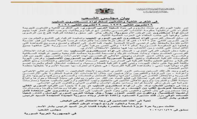 Hatay'ın Türkiye'ye bağlanışının 82. yılında Suriye Halk Meclisi skandal bir bildiri yayınladı. Suriye Parlamentosunun yayınladığı bildiride, Hatay'ın Türkiye'den geri alınması için mümkün olan her şeyin yapılacağı söylendi.