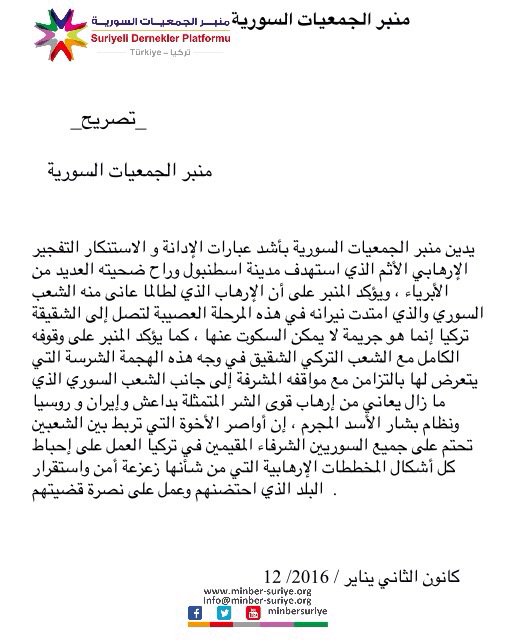 "Bizler Suriyeli olarak her türlü terörün karşısındayız. Kimler ve ne amaçla yapıyor olursa olsunlar insan canına kastedenleri şiddetle kınıyoruz. En zor günlerimizde bize kucak açan Türk halkına karşı yapılan bu terörü lanetle kınıyoruz. Bizler terörün ne olduğunu en çok bilen ve yaşayan insanlarız. Bu sebeple her daim Türkiye nin ve Türk Halkının yanında olacağız. Kardeşlik bağımızın koparılmasına asla izin vermeyeceğiz. Türkiye nin yarası bizim yaramızdır. Türkiye deki barış ve güvenin devam etmesi için tüm çabamızı sarfediyoruz ve sarfetmeye devam edeceğiz. Maalesef bir