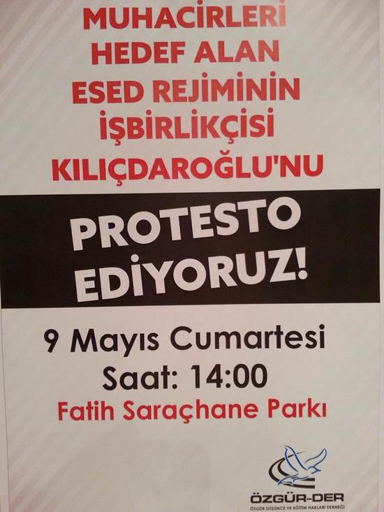 Esed zulmünden kaçarak Türkiye'ye koşan Suriyeli muhacirleri ülkelerine göndereceğini seçim vaadi olarak meydanlarda dile getiren CHP'li Kemal Kılıçdaroğlu Cumartesi günü Fatih'te protesto edilecek.