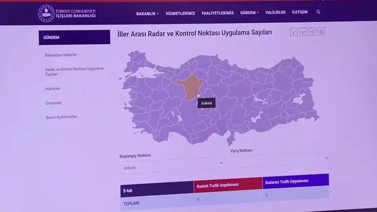 İçişleri Bakanlığı, sürücülerin bilgilendirilmesi ve trafik güvenliğinin sağlanması amacıyla radarlı uygulama noktalarını gösteren yeni bir sistem devreye soktu. Hangi güzergahta kaç radar olduğunu öğrenmek isteyen vatandaşlar, bakanlığın hazırladığı internet sayfası üzerinden kolayca bilgi alabilecek.