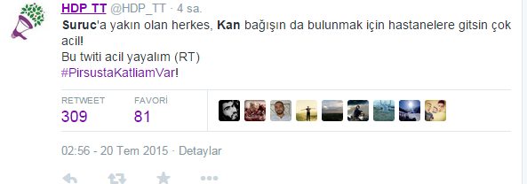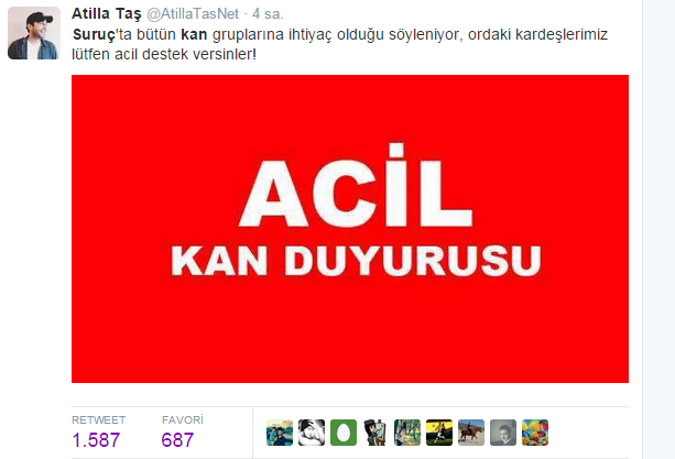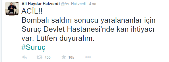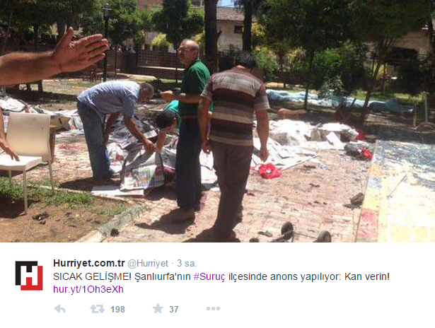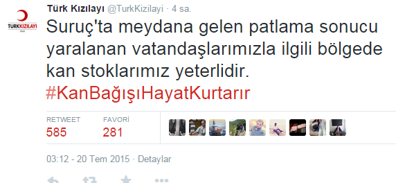 Kızılay konuyla ilgili olarak "Suruç'ta meydana gelen patlama sonucu yaralanan vatandaşlarımızla ilgili bölgede kan stoklarımız yeterlidir" açıklamasını yayınladı.