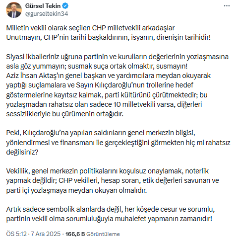 Tekin, ''Aziz İhsan Aktaş’ın genel başkan ve yardımcılara meydan okuyarak yaptığı suçlamalara ve Sayın Kılıçdaroğlu’nun trollerine hedef göstermelerine kayıtsız kalmak, parti kültürünü çürütmektedir; bu yozlaşmadan rahatsız olan sadece 10 milletvekili varsa, diğerleri sessizlikleriyle bu çürümenin ortağıdır. Peki, Kılıçdaroğlu’na yapılan saldırıların genel merkezin bilgisi, yönlendirmesi ve finansmanı ile gerçekleştiğini görmekten hiç mi rahatsız değilsiniz?'' ifadeleri kullandı.