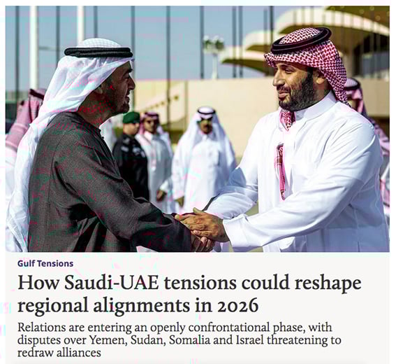 Suudi Arabistan ile Birleşik Arap Emirlikleri (BAE) arasındaki sarsılmaz ittifak ve kardeşlik, İsrail başta olmak üzere Yemen, Sudan ve Somali üzerindeki anlaşmazlıklar nedeniyle düşmanlığa dönüştü. Middle East Eye sitesinin haberine göre Körfez’in iki kilit ülkesinin ilişkilerinin açıkça çatışmacı bir aşamaya girdiği belirtilirken, 2026’nın belirleyici olacağı ifade edildi.