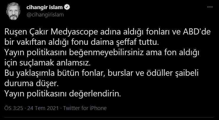 ABD tarafından fonlanan Medyascope'un yöneticisi Ruşen Çakır'a, eski İslamcı yeni CHP'li Cihangir İslam'dan savunma geldi. CHP'li Cihangir İslam'ın bu savunması, "Başka konularda da bu cihangirliği(!) bekleriz" dedirtti.