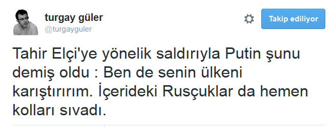Güler, Twitter hesabından, "Tahir Elçi'ye yönelik saldırıyla Putin şunu demiş oldu: Ben de senin ülkeni karıştırırım. İçerideki Rusçuklar da hemen kolları sıvadı." diye yazdı.
