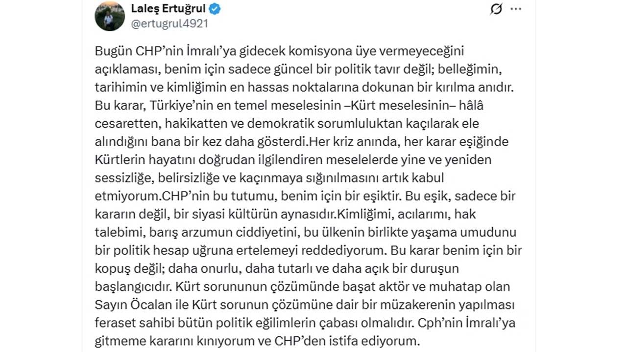 Amedspor yöneticisi Laleş Ertuğrul Uysal, CHP’nin İmralı’ya gitmeme kararına sert tepki göstererek partisinden ayrıldığını duyurdu. Kararın yanlış olduğunu savunan Uysal, istifasının gerekçesini kamuoyuna duyurdu.
