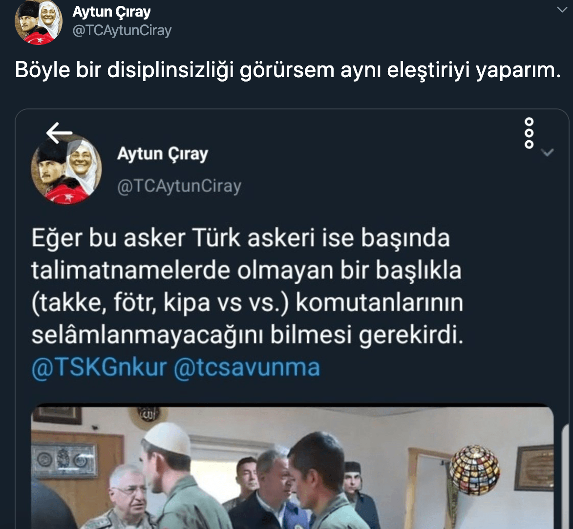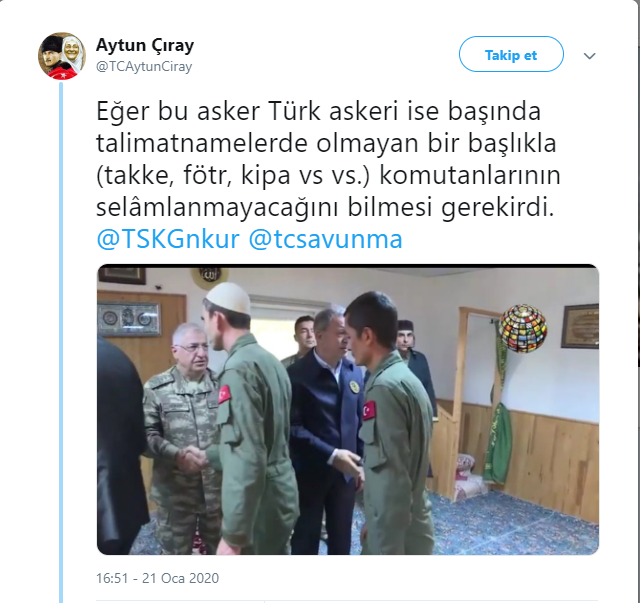 İYİ Parti Genel Başkan Yardımcısı ve İzmir Milletvekili Aytun Çıray, "Eğer bu asker Türk askeri ise başında talimatnamelerde olmayan bir başlıkla (takke, fötr, kipa vs vs) komutanlarının selamlanmayacağını bilmesi gerekirdi." ifadelerini kullandı.
