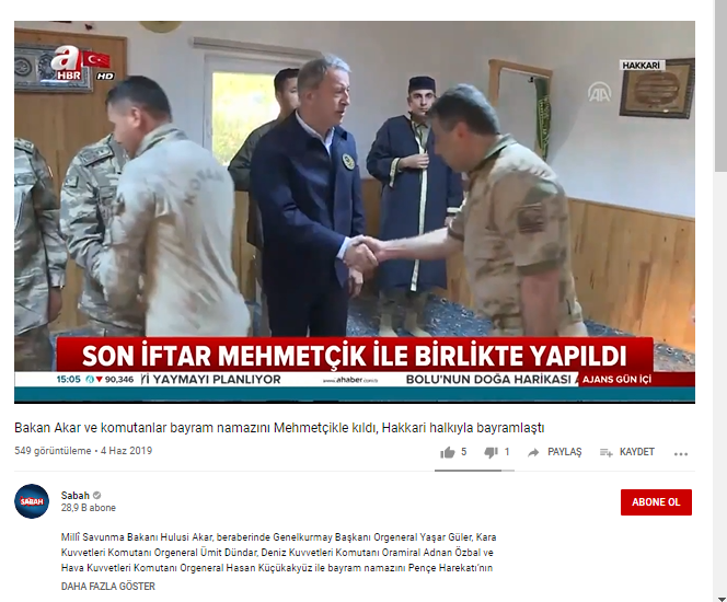 Milli Savunma Bakanı Hulusi Akar, 2019’un Haziran ayında, Ramazan Bayramı namazını Hakkari’nin Derecik ilçesinde 34. Hudut Tugay Komutan Yardımcılığı mescidinde kılmış ve namaz sonrası kahraman Mehmetçik ile tokalaşmıştı.