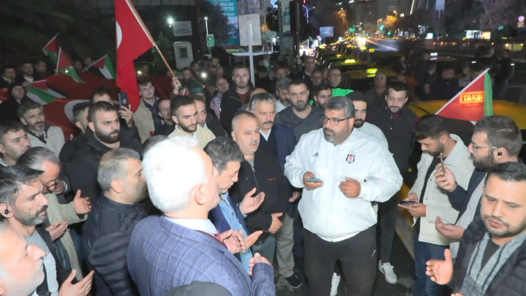 Şişli'de toplanan yüzlerce taksici, Filistin'e destek amacıyla araçlarıyla konvoy oluşturarak İsrail'i protesto etti. Hareket etmeden önce Büyükdere Caddesi'nde toplanan taksiciler, ellerinde Türk ve Filistin bayrakları ile İstiklal Marşı okuyup saygı duruşunda bulunduktan sonra hayatını kaybedenler için dua ettiler.