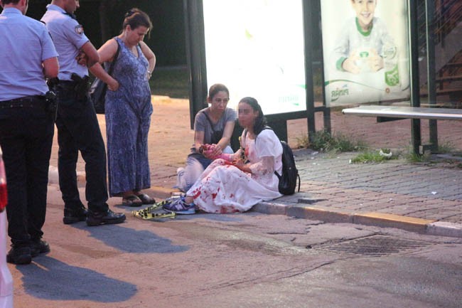 Otobüs durağında yerde oturan genç kadının üzerinde bulunan beyaz elbisenin kanamadan dolayı kırmızıya döndüğü görüldü. Kadını ilk görenlerden bir vatandaş, Ben parkta oturuyordum. Kadın parkta oturuyordu. Yola çıktı geldi. Ne yapıyorsunuz? dedim. Bileğimi kestim bir şey olur mu? dedi. Kötü durumdaydı. Bileği kesilmişti" diyerek yaşananları anlattı. İlk müdahalesi olay yerinde yapılan kadın ambulansla hastaneye kaldırıldı.