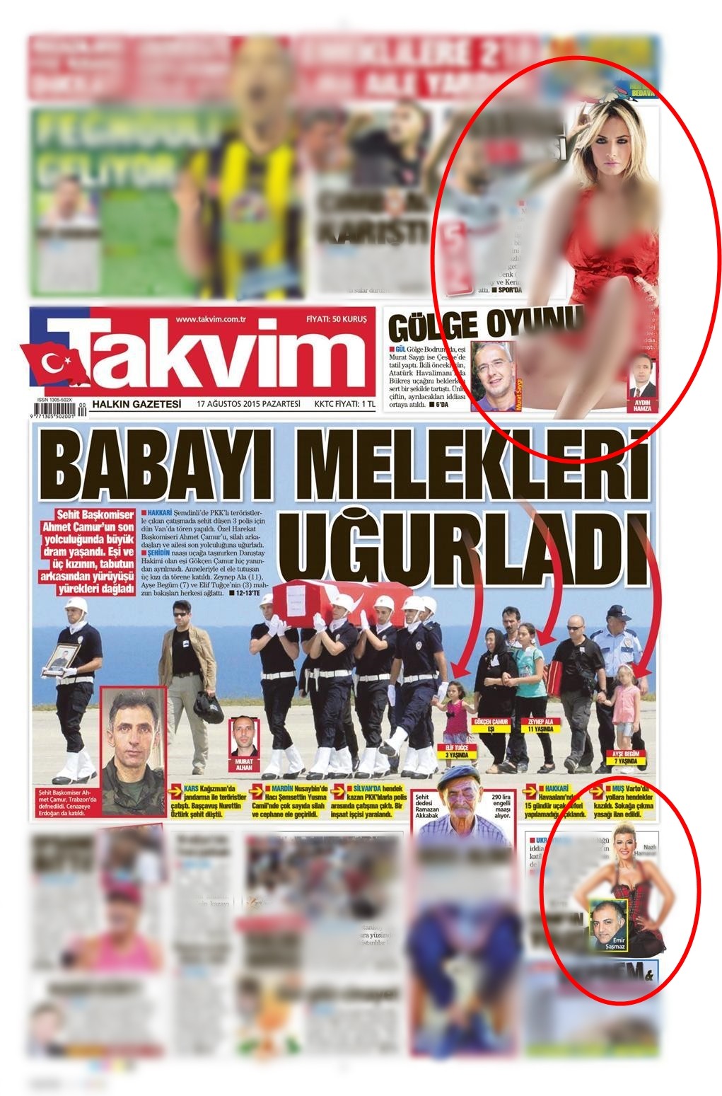 Türkiye kritik bir süreçten geçiyor, siyasetteki belirsizlik ve artan terör olayları ülke gündemini meşgul ediyor. Her gün gelen şehit haberleri yürekleri sızlatırken hükümete yakınlığı ile bilinen Takvim gazetesi bugünkü birinci sayfasından skandal bir fotoğraf yayınladı. Gazetede manşetten görülen şehit haberinin üstünde ‘müstehcen kadın’ fotoğrafına yer verildi. Yayın politikası herkesçe bilinen Takvim'de bu skandal resmin gazetenin yetkililerinden gizli mi girildiği sorusu akıllara geldi.