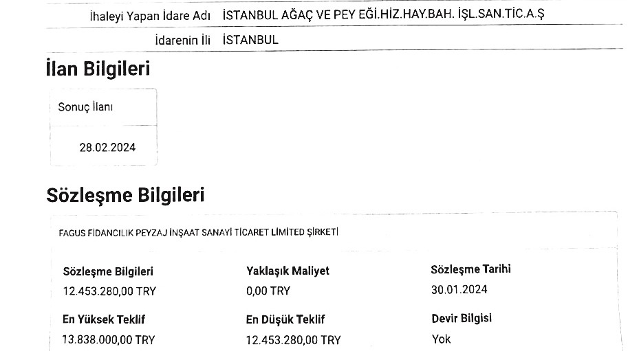 Yine Ağaç A.Ş. tarafından 30 Ocak 2024’te düzenlen ve yaklaşık maliyet hesaplama gereği duyulmayan “Bitki Alımı” ihalesi de Gümüş ailesine gitti. Kısmi teklif verilebilinen ballı ihale Tamer Gümüş’ün öz kardeşi Yusuf Gümüş’e ait Fagus fidancılık Ltd. Şti.’ye 12 milyon 453 bin 280 liraya teslim edildi. Bütün ithal ağaç alımlarını ve lale soğanı temin işlerini yandaş firmalar üzerinden halleden CHP’li İBB Başkanı Ekrem İmamoğlu’na bağlı İstanbul Ağaç ve Peyzaj A.Ş. Genel Müdürü Ali Sukas’ın, adrese teslim ihalelerde büyük bir vurguna imza attığı öne sürüldü.