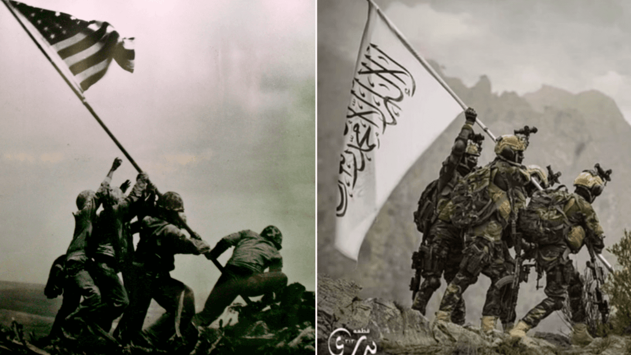 Taliban güçleri çekilen Afgan kuvvetlerinden ele geçirdikleri ABD yapımı taktik teçhizatı giyerek 2. Dünya Savaşı sırasında ABD askerlerinin Iwo Jima Savaşı'nda Suribachi Dağı'na diktikleri propaganda amaçlı bayrak pozuna benzer bir fotoğraf çekerek ABD ile dalga geçti.