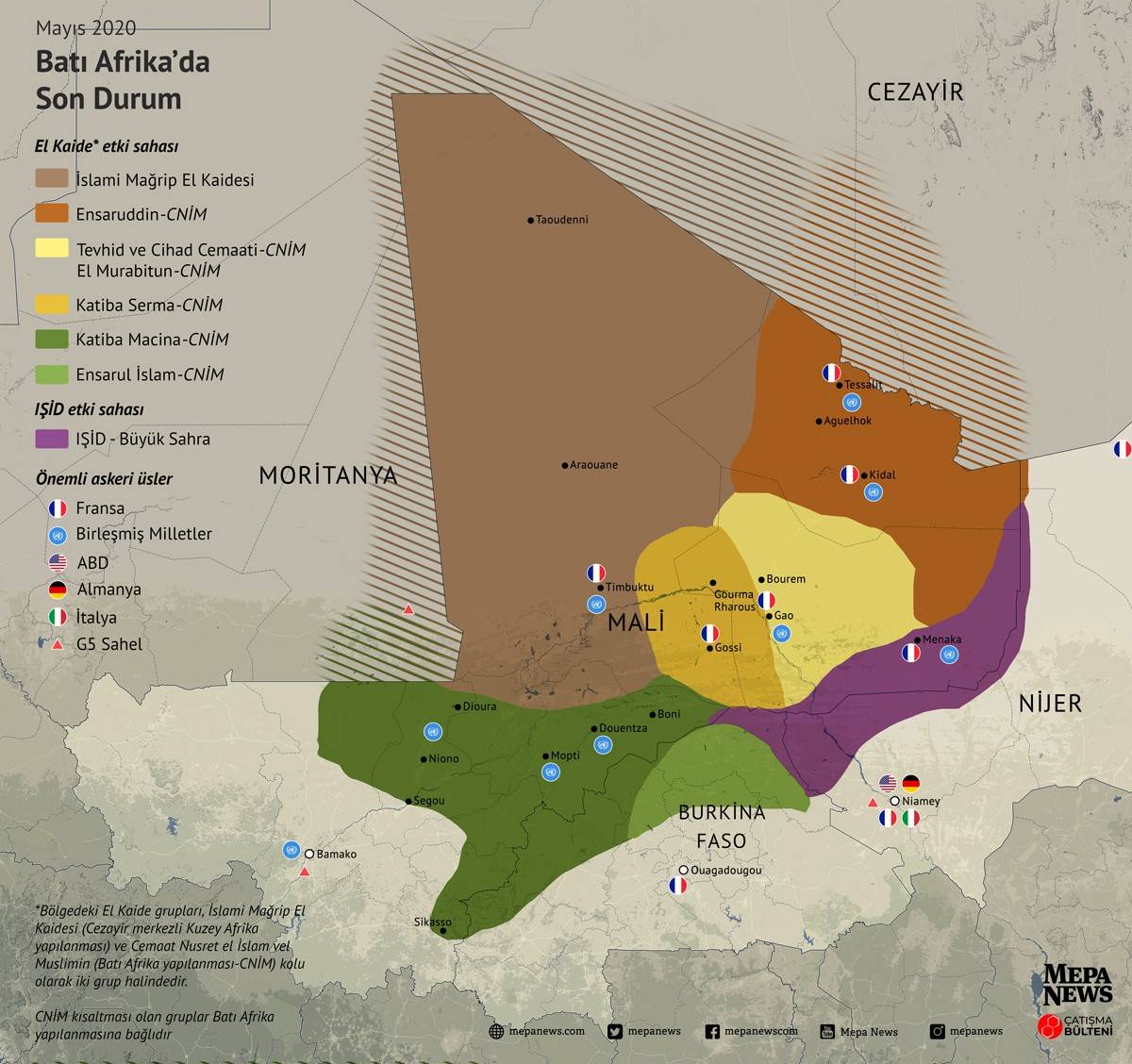 Özellikle Mali'nin kuzeyindeki Timbuktu, Tessalit, Gao, Kidal gibi bölgelerde ve ülkenin orta kesimindeki Mopti çevresinde saldırılarını artıran grup karşısında Fransa öncülüğündeki güçlerin kayıpları günden güne arttı.
