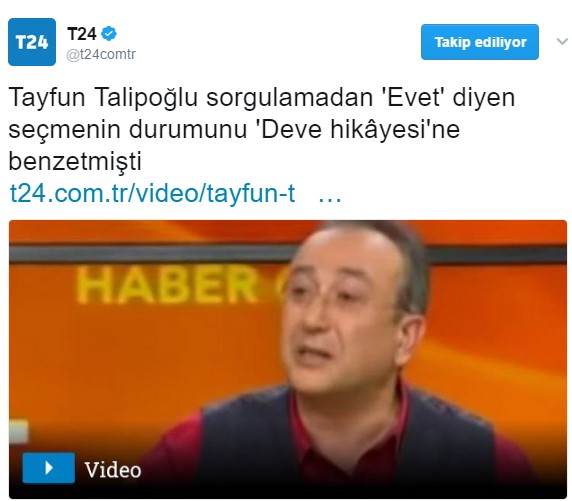 Önce T24 adlı haber sitesi, Talipoğlu'nu siyasete alet etti. Talipoğlu'nun bir programdaki konuşmasını haberleştiren site "Evet diyenlere deve demişti" şeklinde bir habere imza attı.
