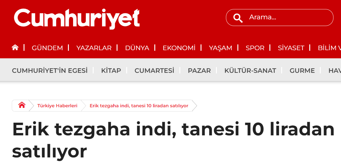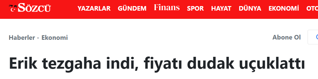 Yaz meyvesi olan yeşil erik, her sene bahar aylarında yüksek fiyattan satılıyor. Bunu fırsat bilen Sözcü ve Cumhuriyet gibi paçavralar, erik üzerinden ekonomi battı edebiyatı yapıyor. Bu sene de erik yüksek fiyata satışa başladı, seçim öncesi muhalif gazetelerin ekonomi battı edebiyatı yapmasına ramak kaldı!..