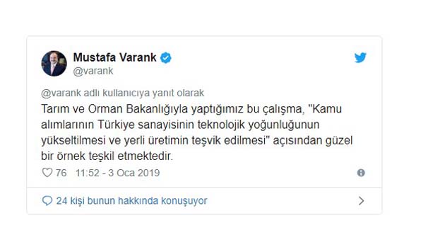 Varank, Tarım ve Orman Bakanlığı ile yapılan çalışmanın, ‘kamu alımlarının Türkiye sanayisinin teknolojik yoğunluğunun yükseltilmesi ve yerli üretimin teşvik edilmesi açısından güzel bir örnek teşkil ettiğini söyledi.