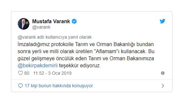 İmzalanan protokolle Tarım ve Orman Bakanlığının bundan sonra yerli ve milli olarak üretilen “Aflamam”ı kullanacağını dile getiren Varank, “Bu güzel gelişmeye öncülük eden Tarım ve Orman Bakanımıza teşekkür ediyoruz.” dedi.