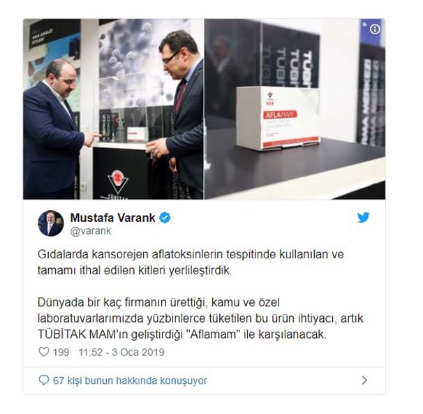 Sanayi ve Teknoloji Bakanı Mustafa Varank, Twitter’dan yaptığı açıklamada, gıdalarda kanserojen aflatoksinlerin tespitinde kullanılan ve tamamı ithal edilen kitlerin yerlileştirildiğini belirtti.