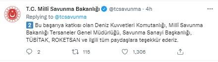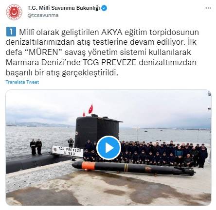 "İlk defa 'Müren' savaş yönetim sistemi kullanılarak Marmara Denizi'nde, TCG Preveze denizaltımızdan başarılı bir atış gerçekleştirildi. Bu başarıya katkısı olan Deniz Kuvvetleri Komutanlığı, Milli Savunma Bakanlığı Tersaneler Genel Müdürlüğü, Savunma Sanayi Başkanlığı, TÜBİTAK, ROKETSAN ve ilgili tüm paydaşlara teşekkür ederiz."