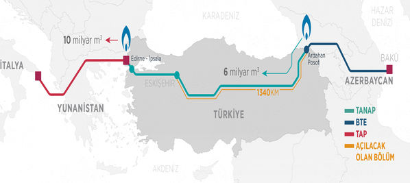 Boru hattına ilk test gazı, 23 Ocak 2018’de basıldı. Türkiye, hattan belli bir sürenin sonunda yıllık 6 milyar metreküp gaz alacak. BOTAŞ’ın yüzde 30 payının bulunduğu TANAP’ın temel atma töreni Cumhurbaşkanı Erdoğan ve Azerbaycan Cumhurbaşkanı Aliyev’in katılımıyla 17 Mart 2015’te Kars’ta gerçekleştirilmişti.