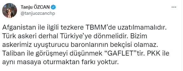 Özcan sosyal medya hesabı üzerinden yaptığı paylaşımda Türkiye’nin Taliban ile görüşmesini ‘Gaflet’ olarak tanımlayarak, “Afganistan ile ilgili tezkere TBMM’de uzatılmamalıdır. Türk askeri derhal Türkiye’ye dönmelidir. Bizim askerimiz uyuşturucu baronlarının bekçisi olamaz. Taliban ile görüşmeyi düşünmek “GAFLET”tir. PKK ile aynı masaya oturmaktan farkı yoktur” ifadelerini kullandı.