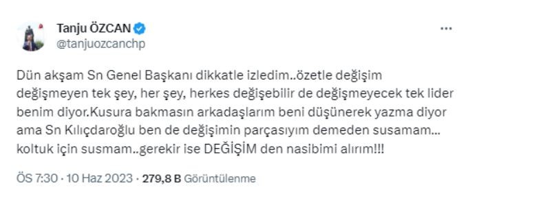 Kılıçdaroğlu'nun sözlerine CHP'de değişim isteyen isimlerin başında gelen Bolu Belediye Başkanı Tanju Özcan'dan tepki geldi. Sosyal medyadan paylaşım yapan Özcan, "Dün akşam Sn. genel başkanı dikkatle izledim. Özetle değişim değişmeyen tek şey, her şey, herkes değişebilir de değişmeyecek tek lider benim diyor. Kusura bakmasın arkadaşlarım beni düşünerek yazma diyor ama Sn. Kılıçdaroğlu ben de değişimin parçasıyım demeden susamam. Koltuk için susmam. Gerekir ise değişimden den nasibimi alırım!!!" ifadelerini kulandı.